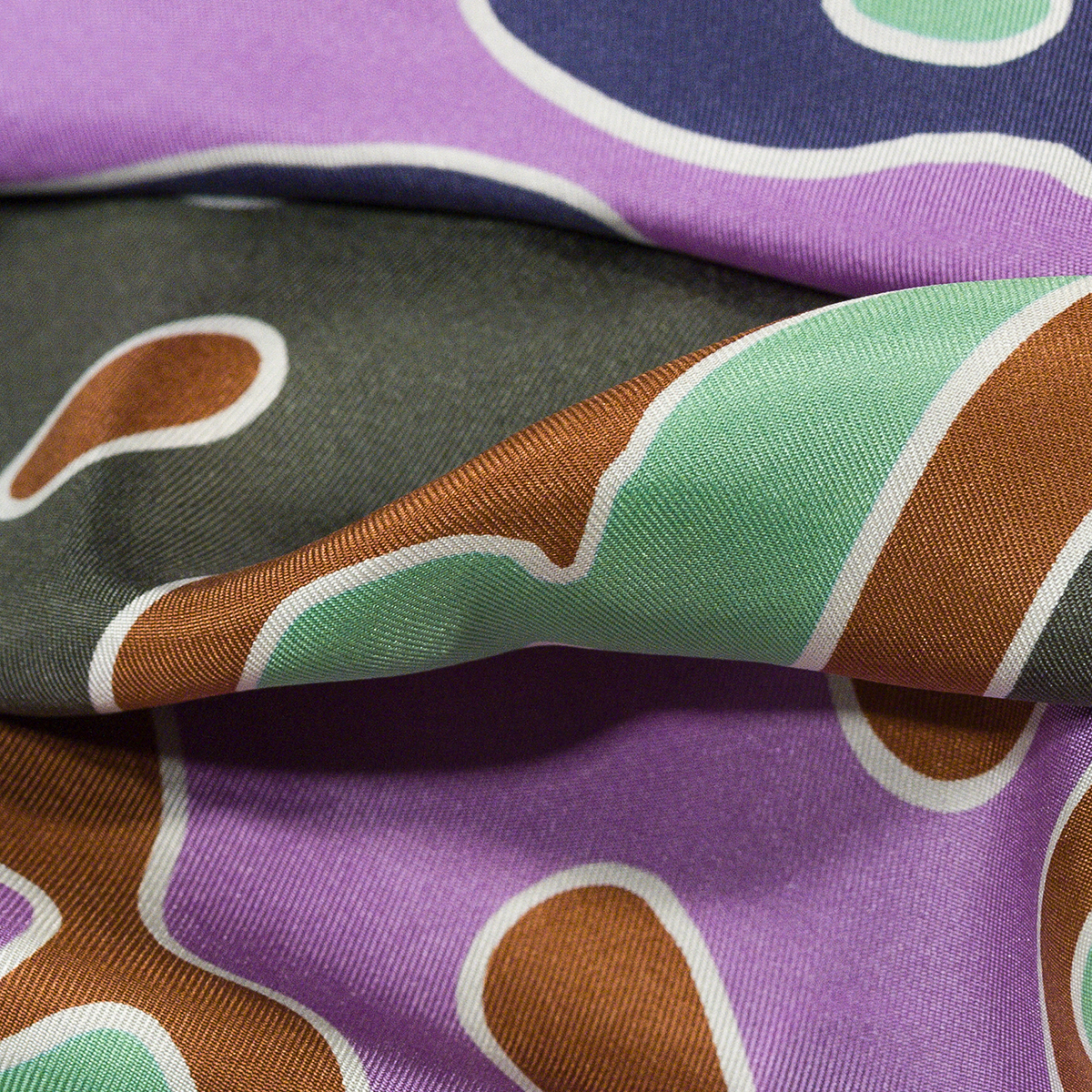 Die Stiftung Basler Wirrgarten, sie kümmert sich um Menschen, die an Demenz erkrankt sind, feierte ihren 20. Geburtstag. Unser Beitrag zu den Feierlichkeiten war die Produktion dieses Foulards. Wir haben es in Zusammenarbeit mit dem Gestalter Andreas Kreienbühl und unserer Farbspezialistin Martina Böhler gemacht. Die ganze Magie basiert darauf, dass die Design-Vorlage in eine 90 Grad-Form gebracht wurde, das quadratische Sieb konnte also um 90 Grad gedreht und so vierfach benutzt werden: horizontal, vertikal, oben, unten. Dies ist die Ursache des Umstands, dass jedes der Foulards vier unterschiedliche Farbspiele aufweist, ein anderes in jedem Ecken.